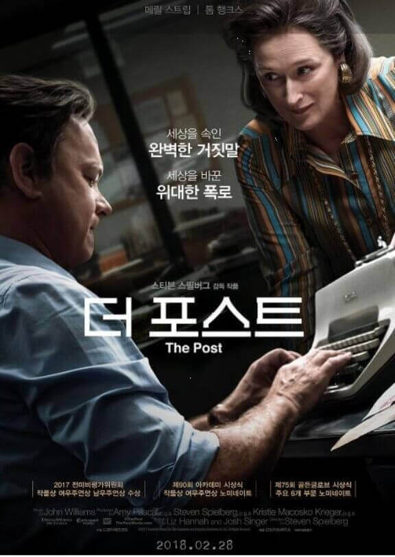 오늘의 영화는 워싱턴 포스트의 신문 발행인 캐서린 그레이엄과 편집국장 벤 브래들리가 정부가 숨기고 있던 펜타곤 기밀문서를 입수라고 베트나마 전쟁 진실을 용기 있게 보도한 실화를 바탕으로 1971년 뉴욕타임스, 월스트리트저널과 함께 미국 3대 일간지인 워싱턴 포스터의 발행인 캐서린의 가치와 신념을 바탕으로 존경받는 리더로 성장하는 이야기를 다룬 2017년 작품이다. 김독 스티븐 스필버그, 주연배우로 톰 행크스, 메릴 스트립 등 이름만 들어도 묵직한 존재감을 주는 이 영화는 미국의 베트남 전쟁에 대한 거짓된 환상을 폭로하는 펜타곤페이퍼 사건을 보도하는 과정에서 워싱턴 포스터의 발행인 캐서린의 리더로서의 힘든 선택과 선택에 있어 자신의 가치와 신념이 얼마나 아름다운가를 잘 보여준다.